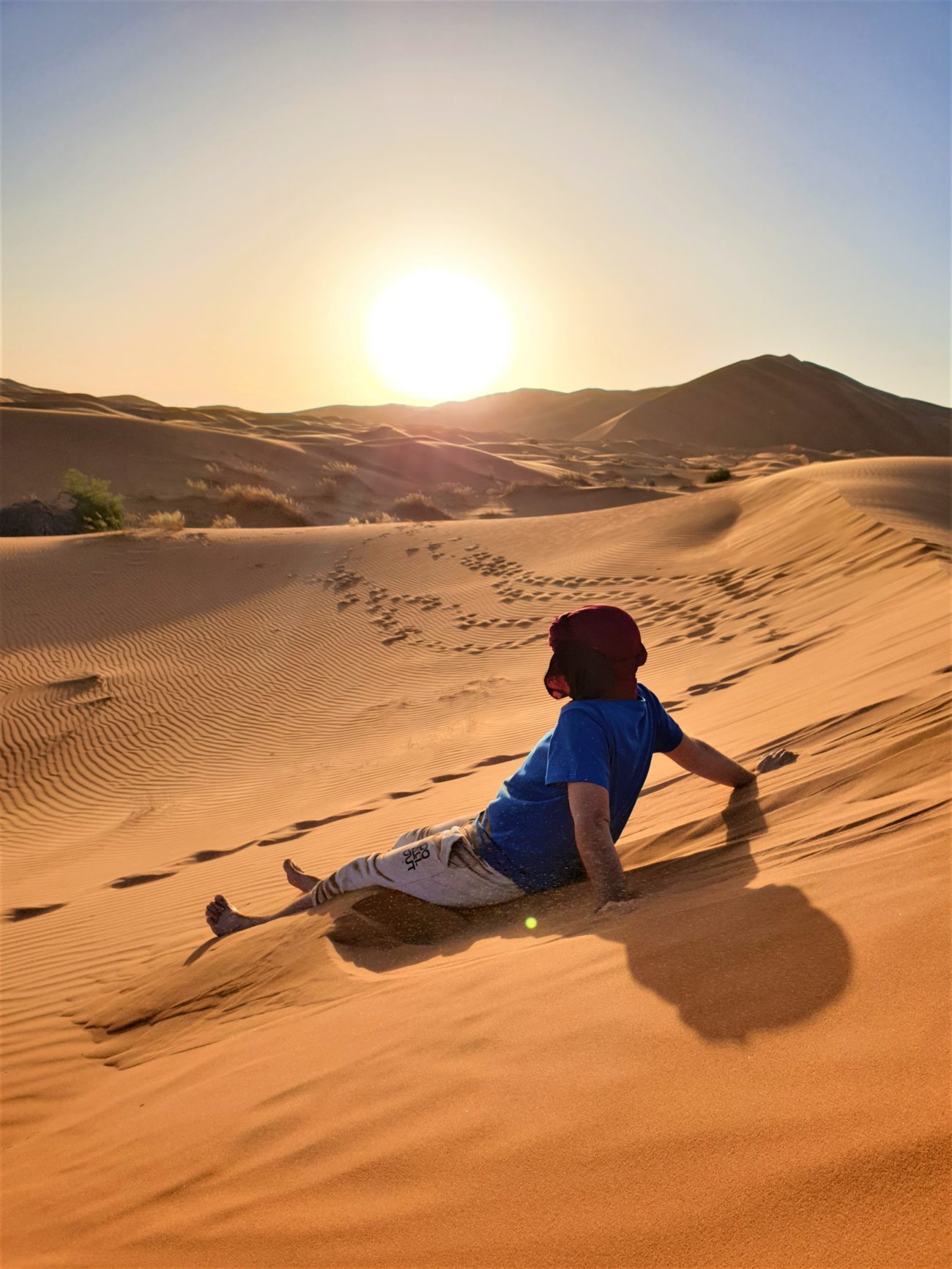 Le temps de prendre possession de notre jolie tente berbère, de faire la connaissance de nos charmants hôtes, berbères eux aussi, de comprendre comment nouer nos chèches pour nous protéger du sable, nous disposons d’une bonne heure pour aller admirer le coucher depuis le sommet de la dune la plus haute…