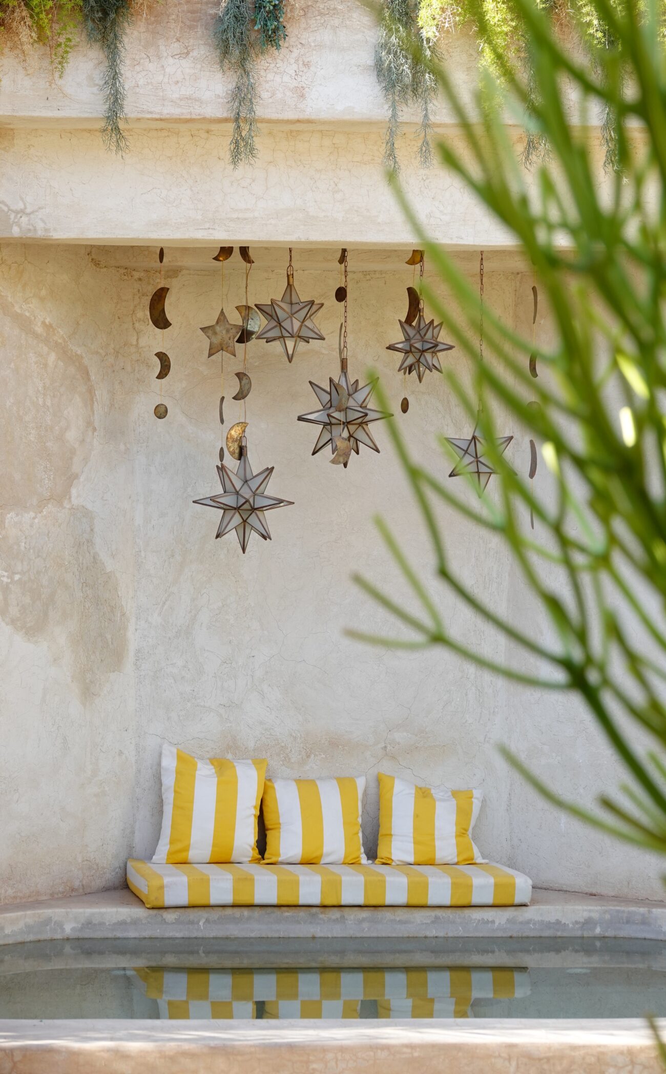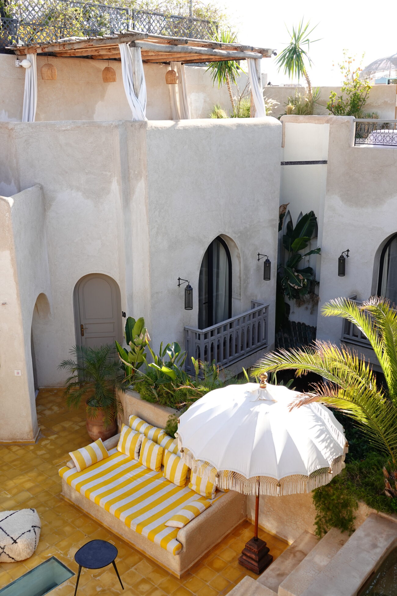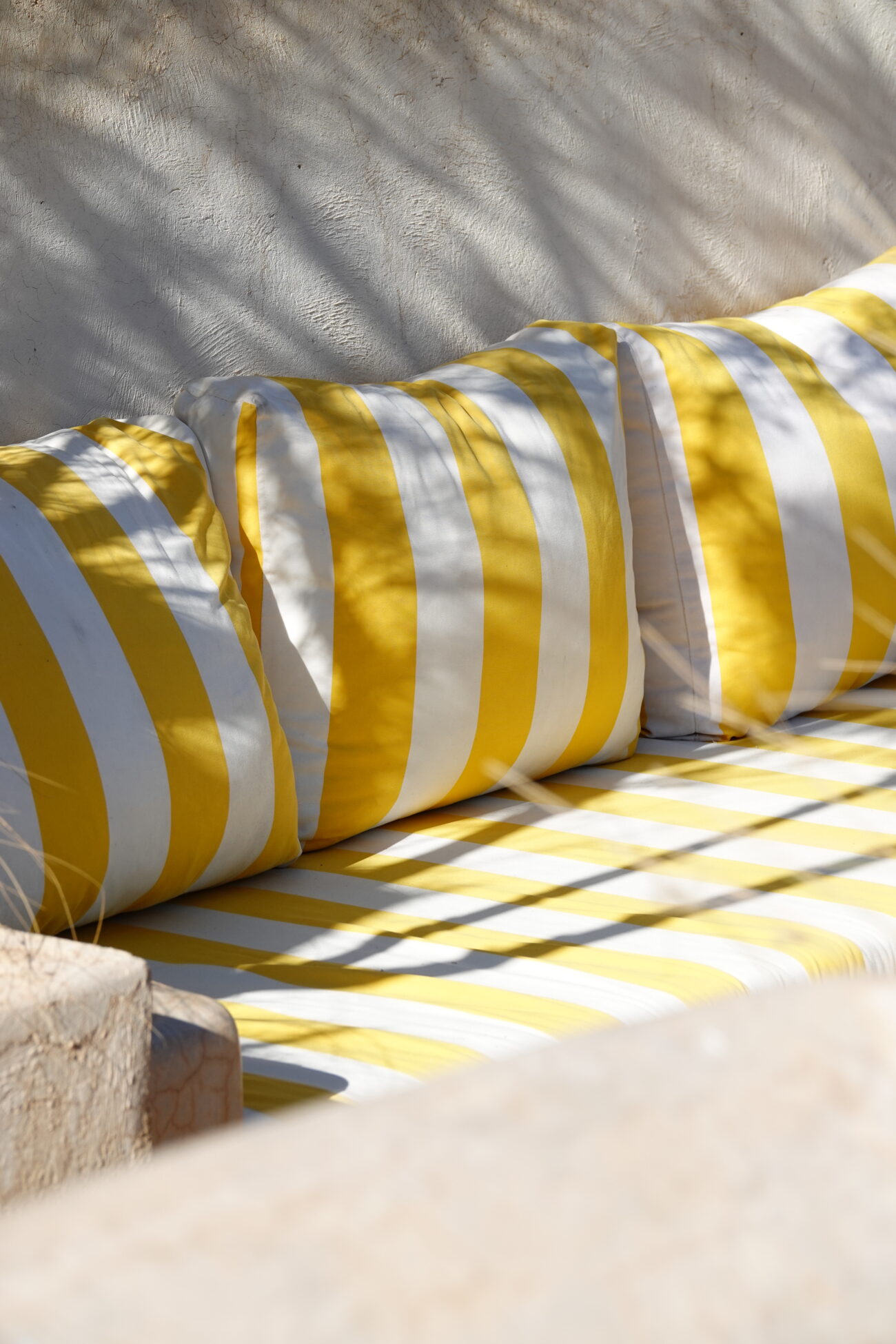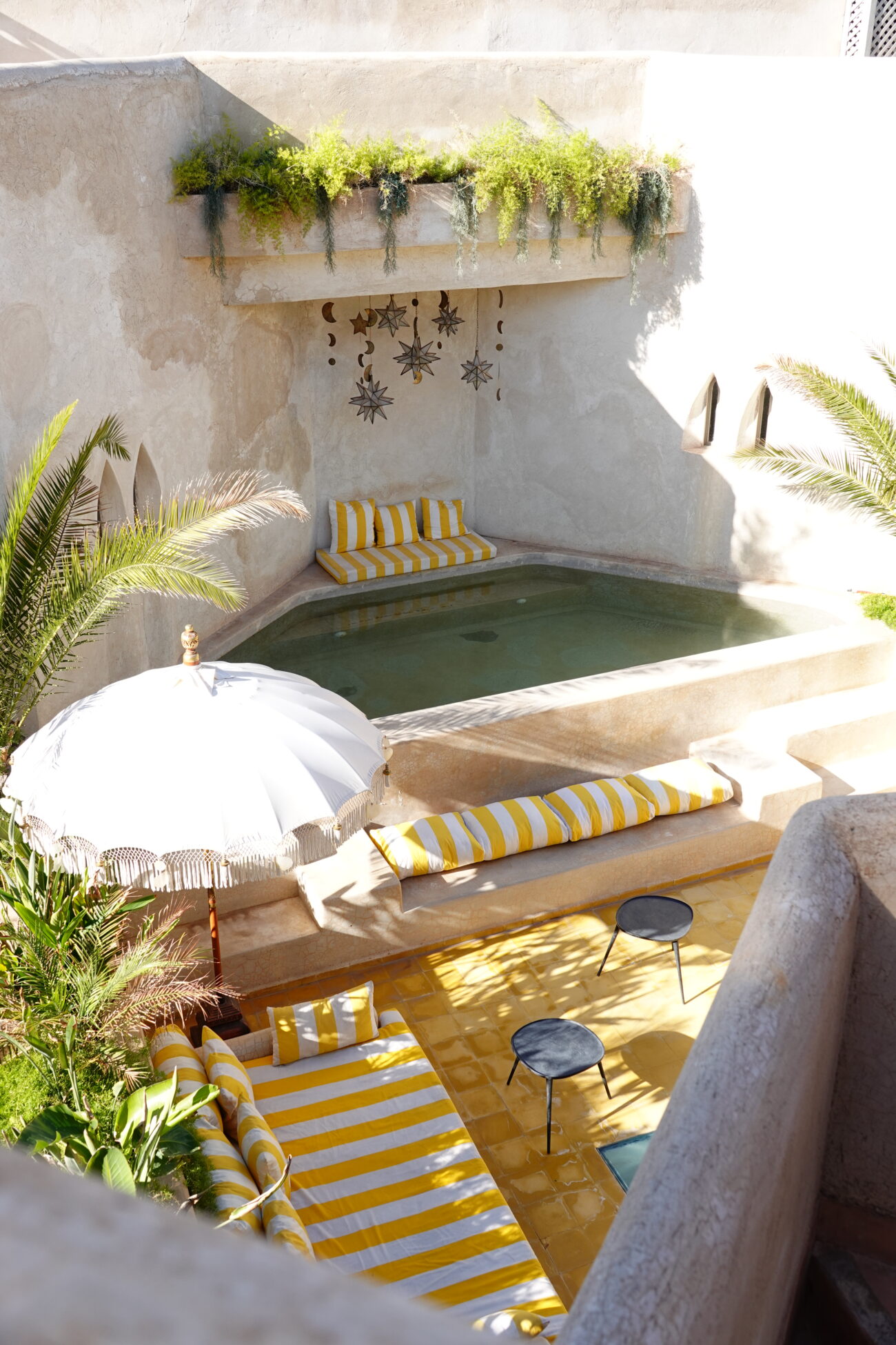 Au Riad XO, les volumes, les matières et la palette jaune et blanche à rayures composent un ensemble harmonieux, pensé pour créer une ambiance à la fois authentique et contemporaine.