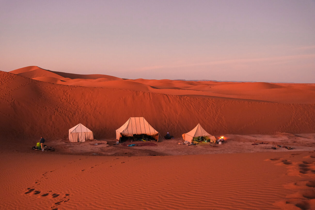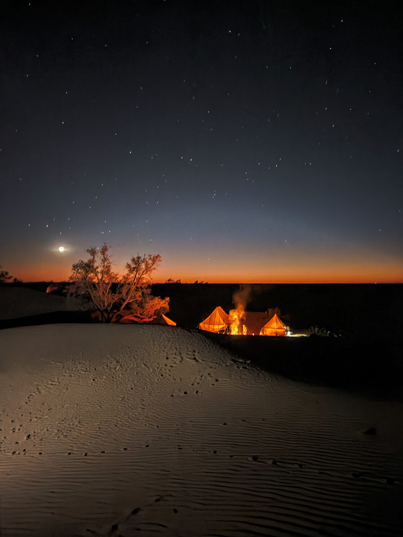 Après une nuit fraîche (l’écart de température avec la journée est énorme), le camp se réveille en douceur à la lueur des premiers rayons du soleil.