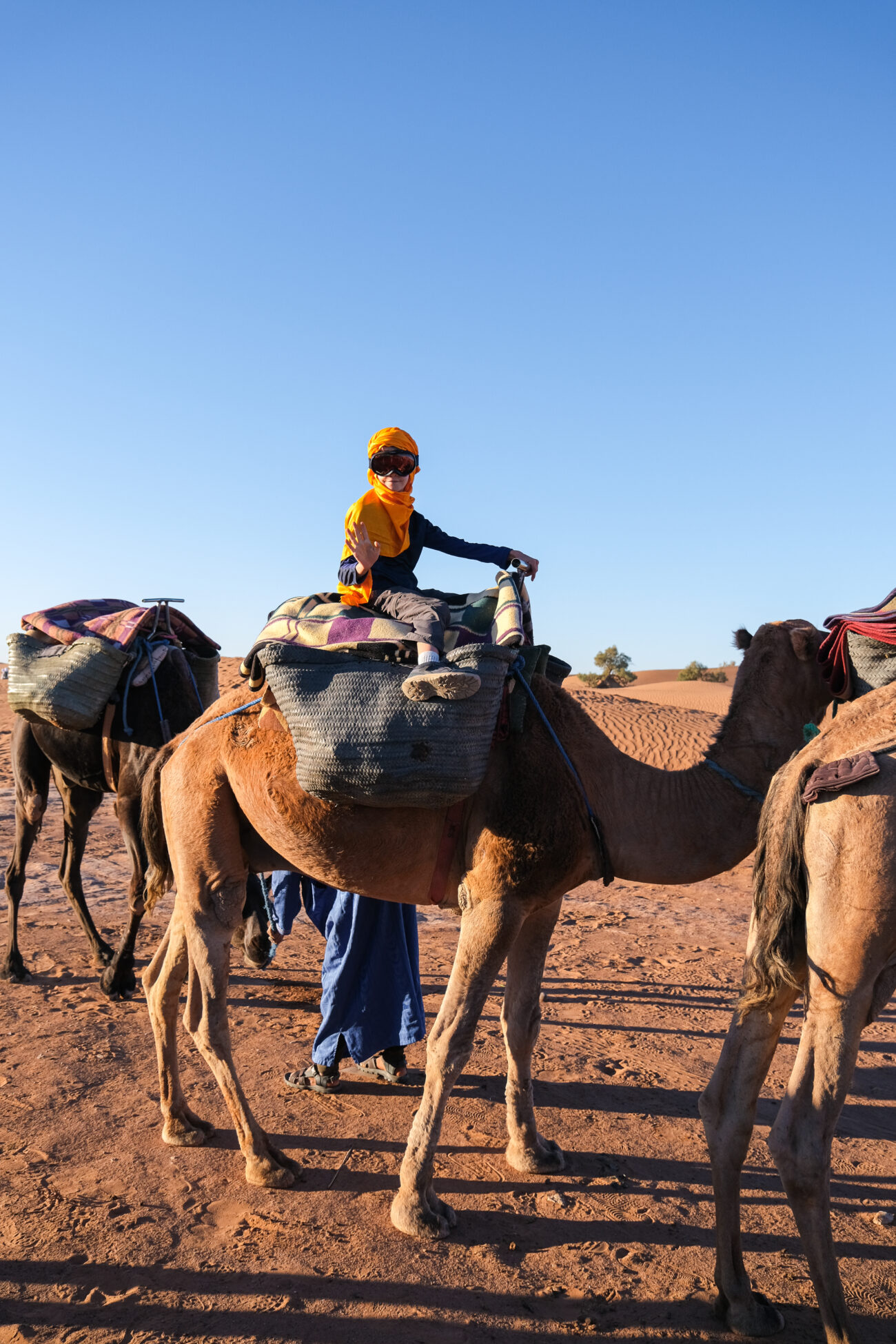 - Nous avions pris un dromadaire de selle pour Maé (qui avait 9 ans lors du trek), et il est resté dessus tout le long. Cela a grandement facilité le trek : la fatigue aurait été difficile à gérer autrement. Je vous conseille donc vivement d’en prévoir un si vous avez des enfants, au cas où !